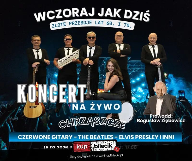 bilety: Zapraszamy na wyjątkowy koncert, który przeniesie publiczność do czasów najpiękniejszych melodii i niezapomnianych emocji. "Wczoraj jak dziś" to muzyczna podróż przez złotą erę lat 60. i 70., gdy piosenki miały duszę, a refreny śpiewała cała sala. Informacje organizacyjne: - Bilety ulgowe przysługują Seniorom Bilety do nabycia na: KupBilecik.pl"Wczoraj jak Dziś" - Złote Przeboje lat 60. i 70. artyści: Różni artyściZapraszamy na wyjątkowy koncert, który przeniesie publiczność do czasów najpiękniejszych melodii i niezapomnianych emocji. "Wczoraj jak dziś” to muzyczna podróż przez złotą erę lat 60. i 70., gdy piosenki miały duszę, a refreny śpiewała cała sala. Bilety do nabycia na: KupBilecik.pl |
